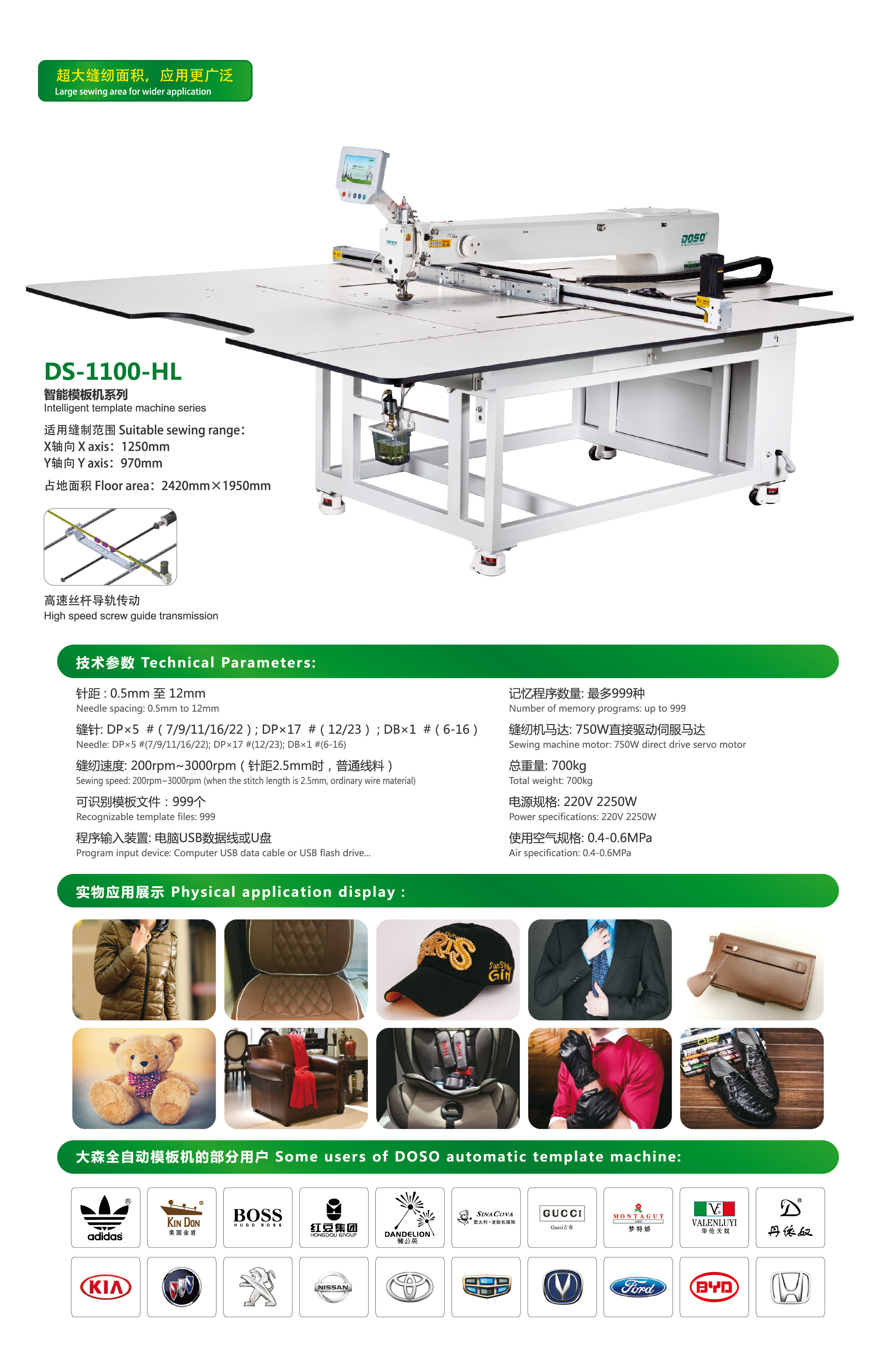 Suitable sewing range: X axis:1250mm Y axis:970mm Floor area:2420mm×1950mm