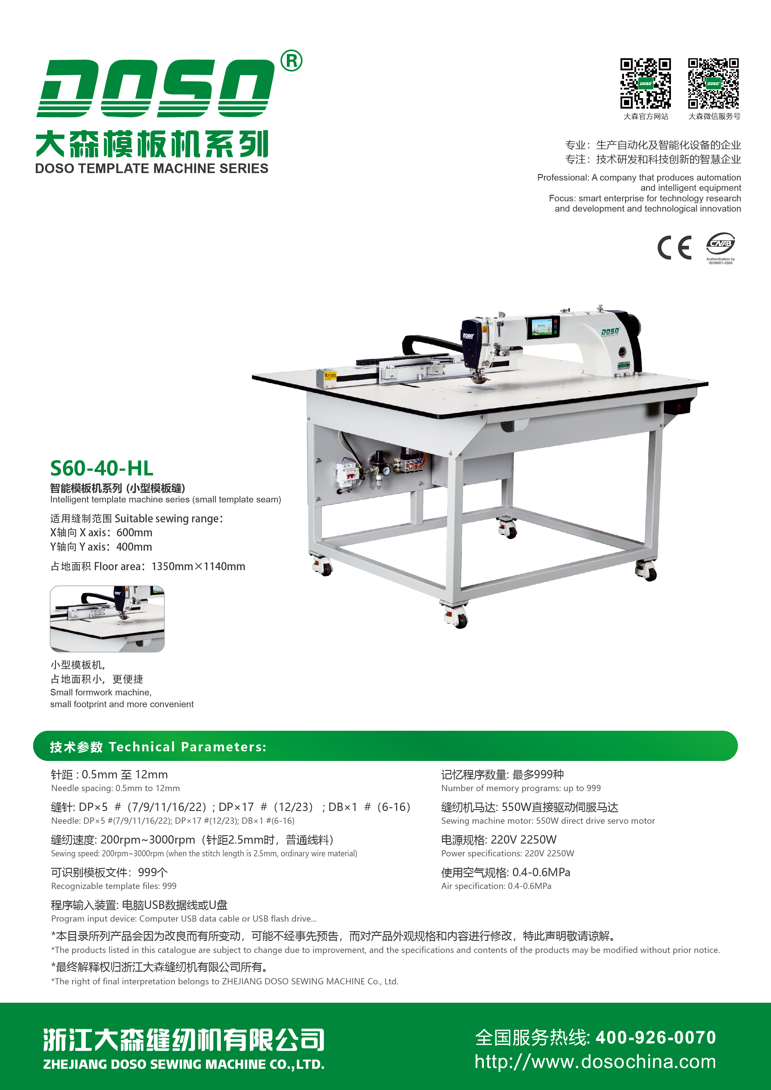 Suitable sewing range: X axis:600mm Y axis:400mm Floor area:1350mm×1140mm